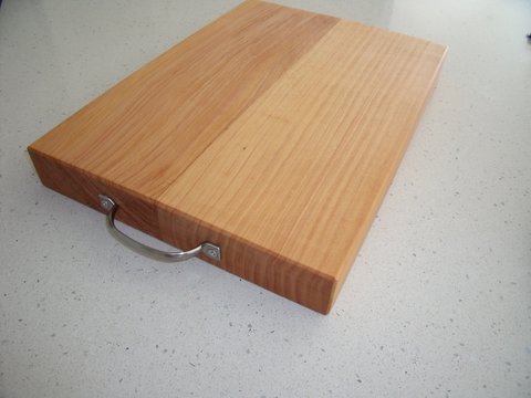 Solid Macrocarpa Chopping Board with convenient stainless steel handle. This sturdy chopping board measures 400mm x 280mm x 45mm thick.
